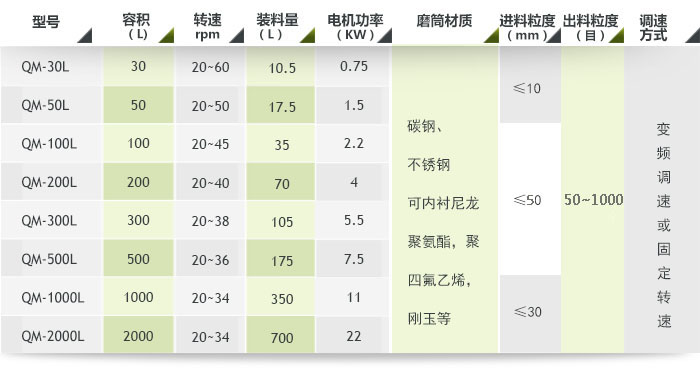 1. 型號說明:QM-(體積)-(A調(diào)速型,B普通型) 如:QM-50-A 為50L調(diào)速型輥筒球磨機(jī);
